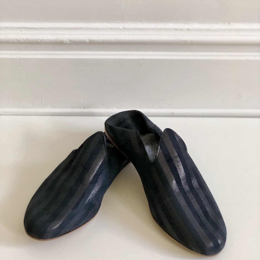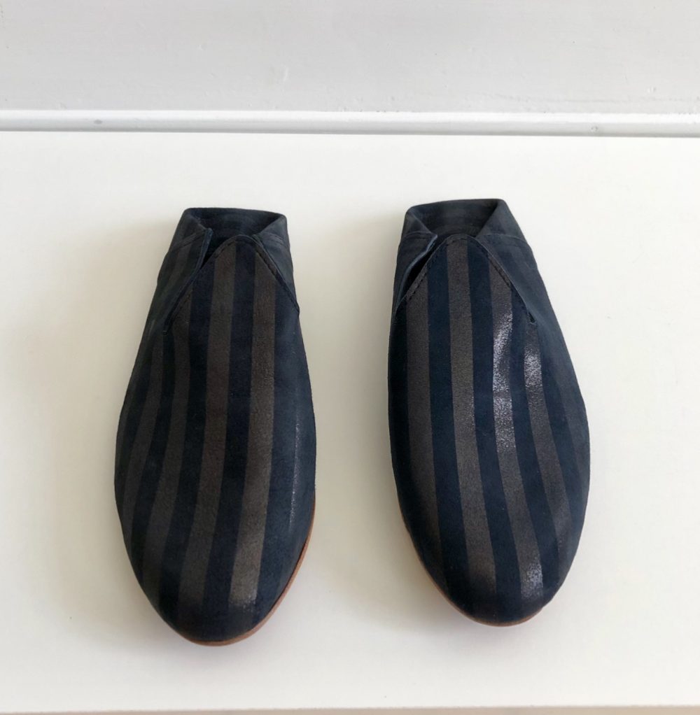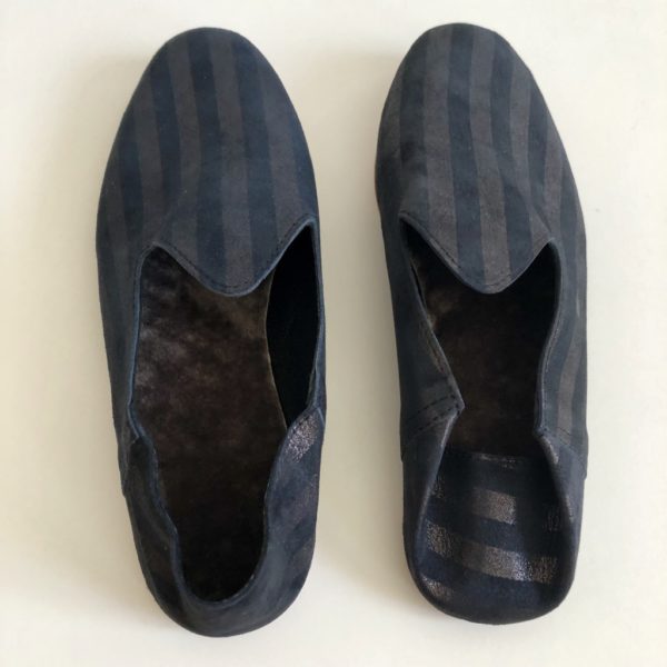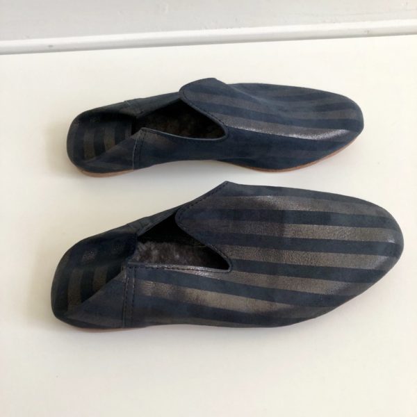 Made in stripped suede leather with inside wool. The best option for those summer nights in the Swedish archipelago or at home during the winter.